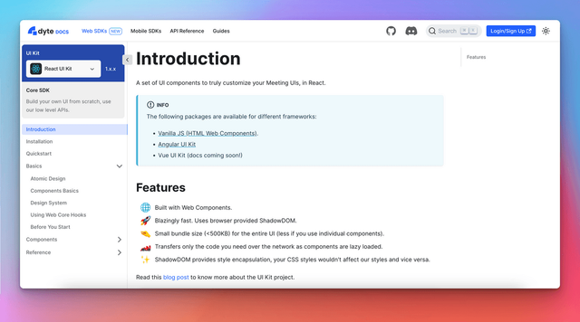 Docusaurus is full-featured and very flexible: we ship with well-designed docs and blog layout, as well as out-of-the-box versioning, search, and internationalization functionalities, with a call to accessibility and search engine optimizations. Its flexible theming system permits to adapt the UI to match your branding so that it integrates nicely with your main website or documentation portal. Its usage of React enables a modern client-side navigation, and the ability to build an interactive documentation.